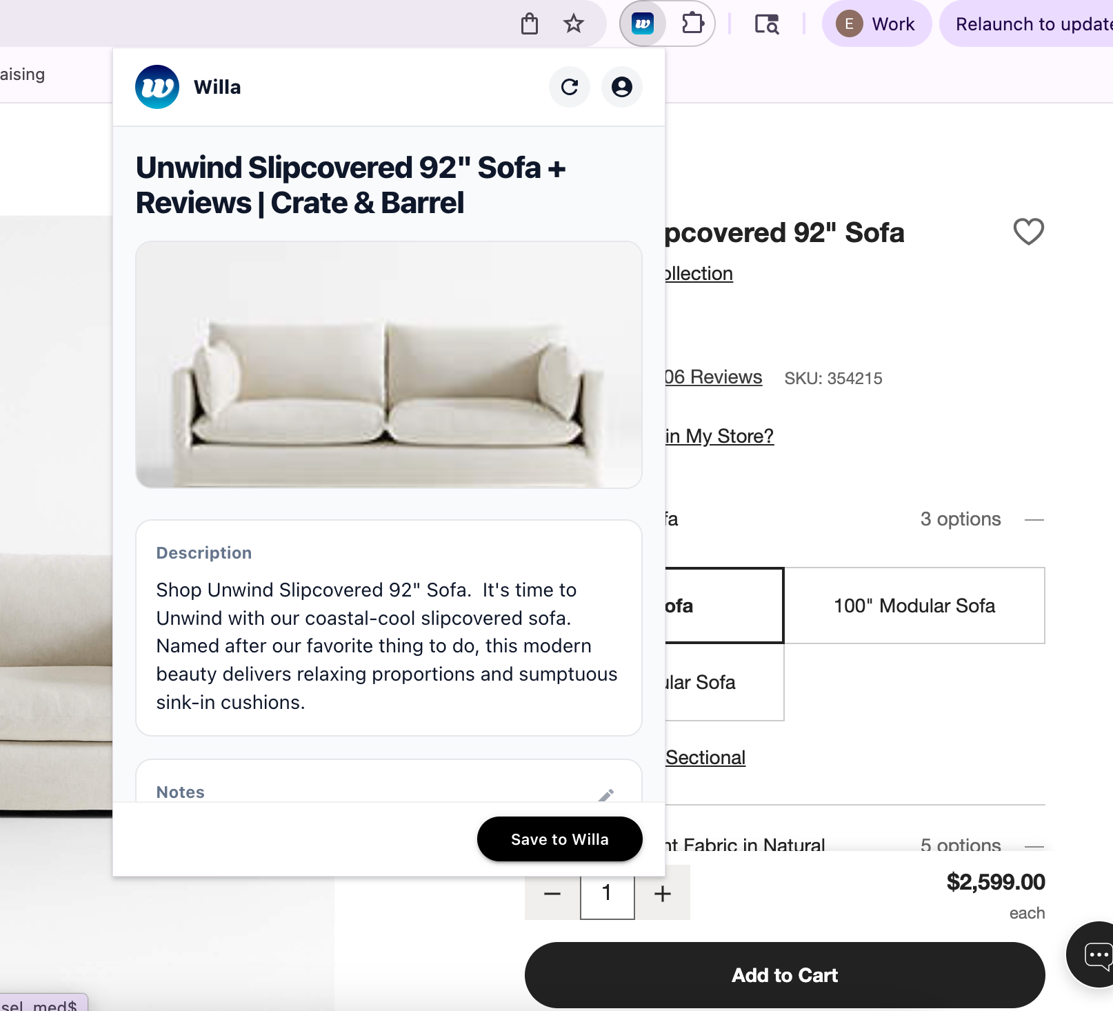 See something you love? Save it to Willa without leaving the page. Add notes, pick a board, and keep browsing. No more endless tabs. It's that simple.