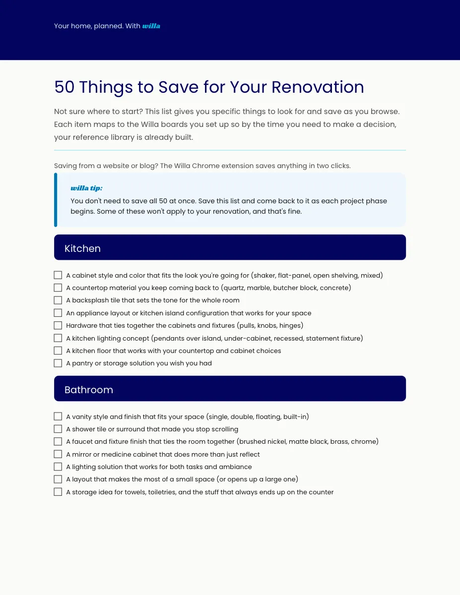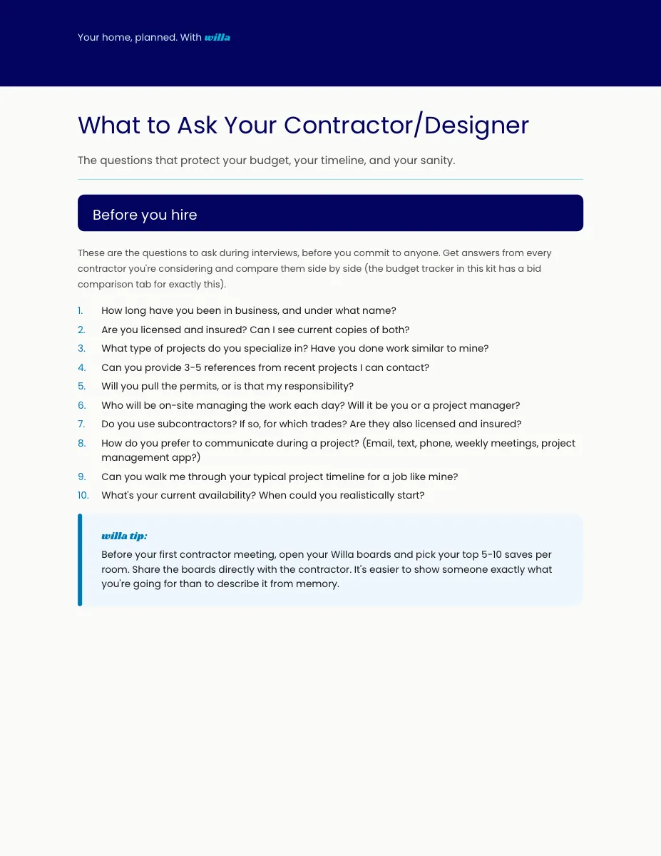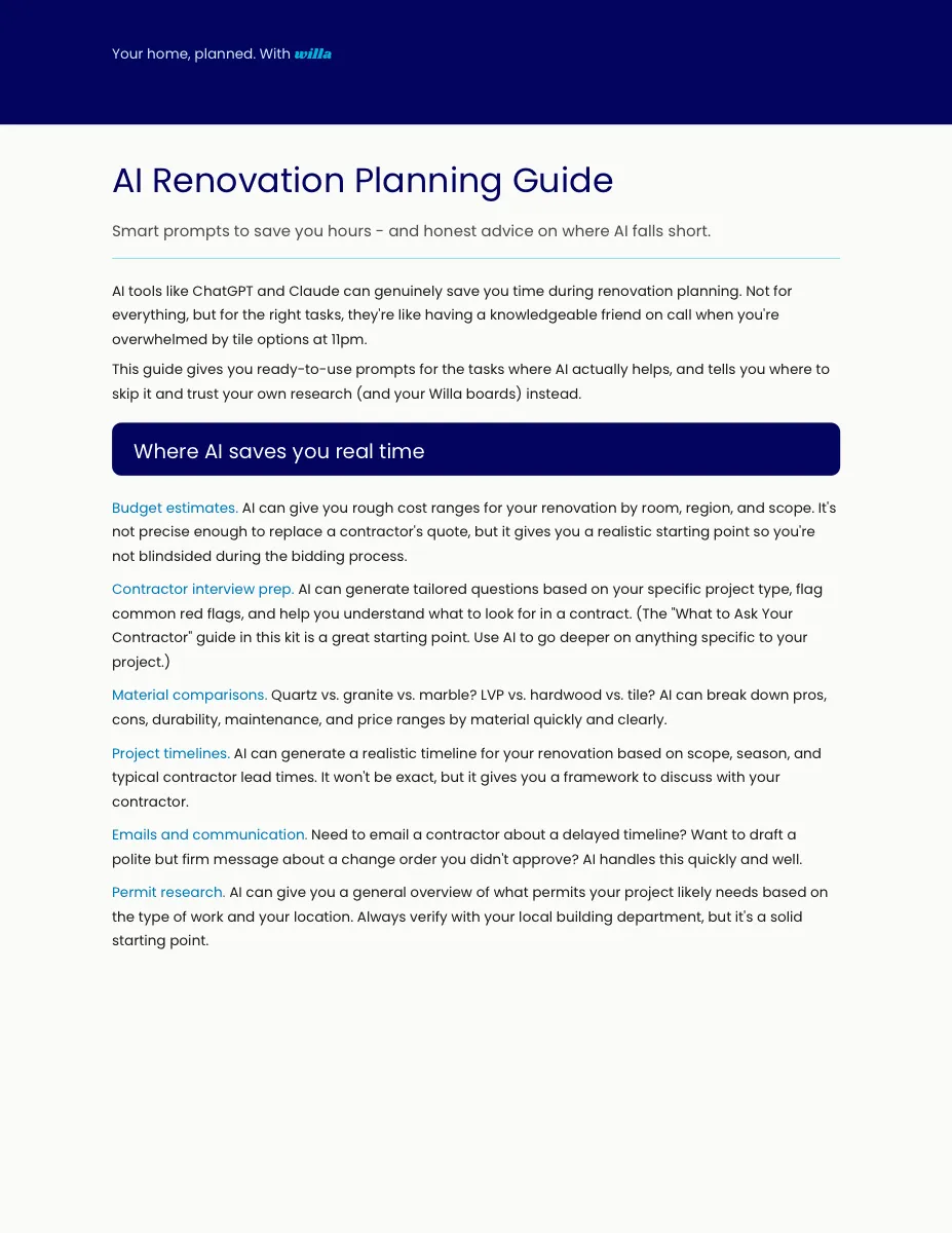 — When and how to use AI and when to skip it. Ready-to-use prompts for budgets, contractor prep, material comparisons, and more (3-page PDF)How to Plan Your Renovation with Willa