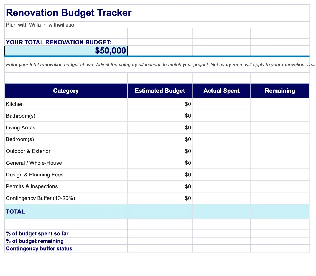 — 34 questions organized by phase: before you hire, before work begins, during the project, and at completion. Plus a DIY section (3-page PDF)Renovation Budget Tracker