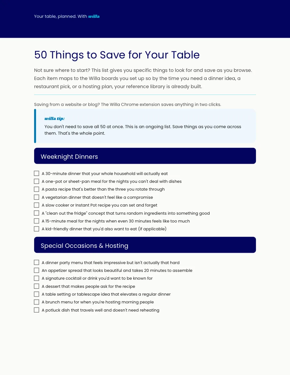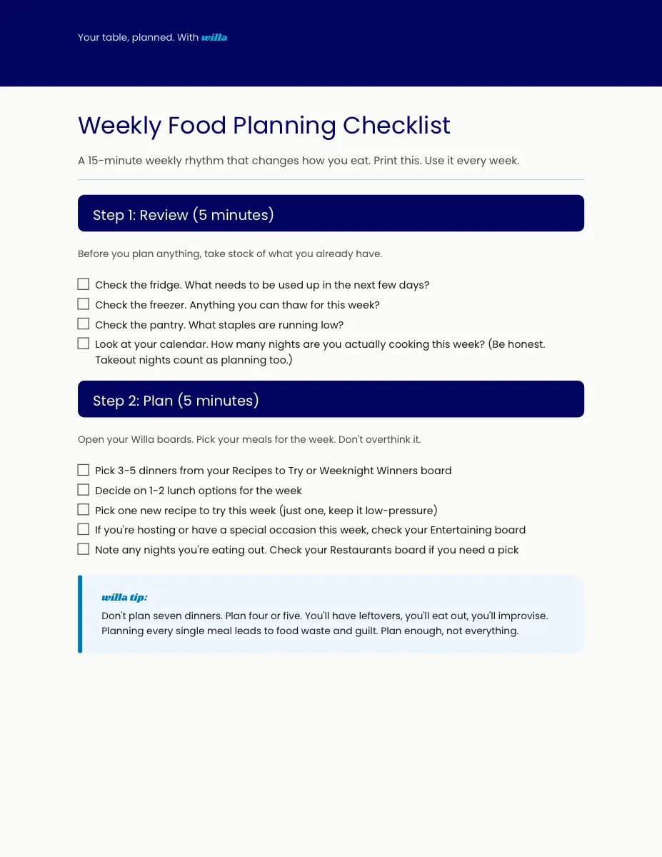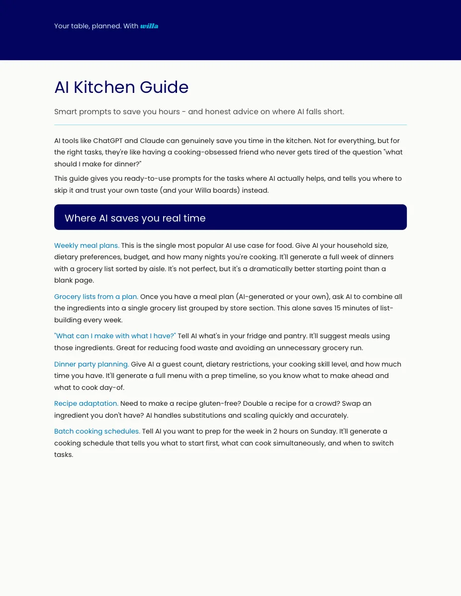 — When and how to use AI and when to skip it. Ready-to-use prompts for meal plans, grocery lists, dinner party menus, and "what can I make with what I have" (3-page PDF)How to Organize Your Food Life with Willa