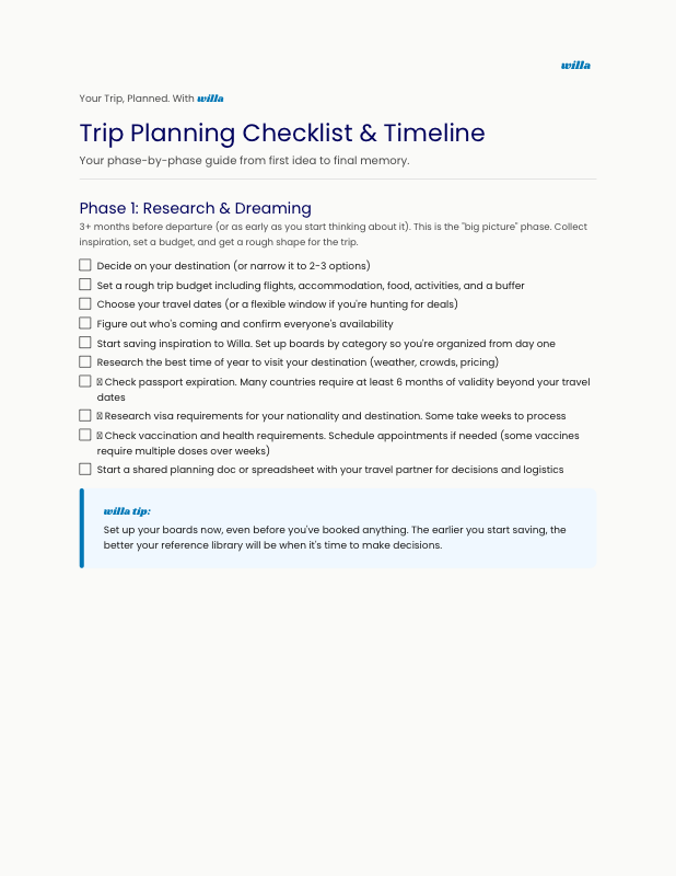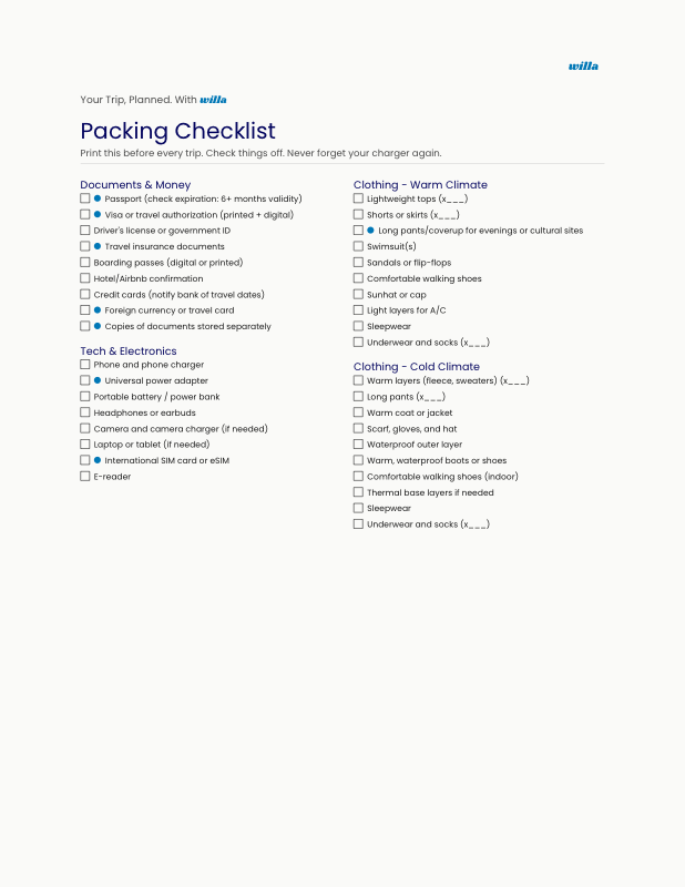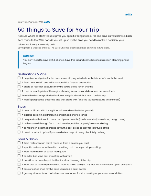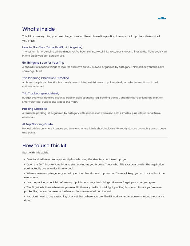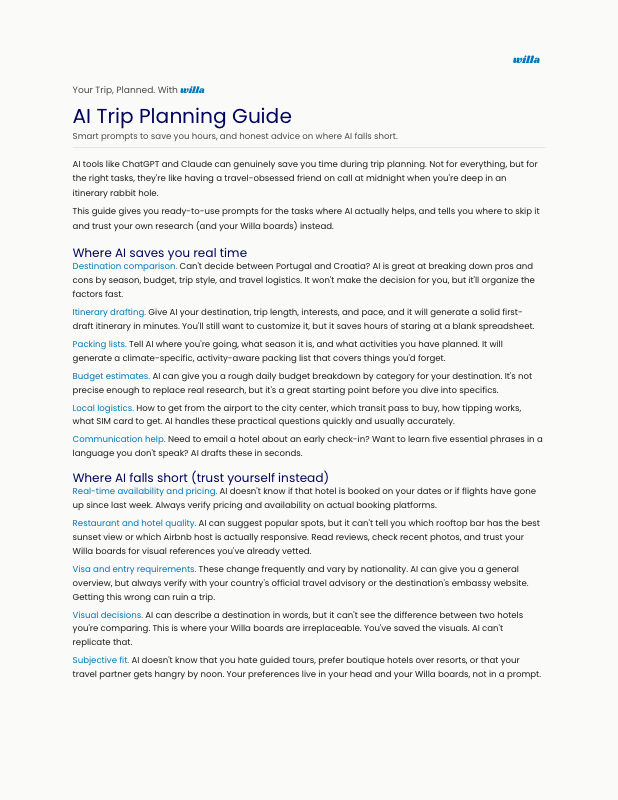 — When and how to use AI and when to skip it. Ready-to-use prompts for itineraries, budgets, local tips, and more (3-page PDF)How to Plan Your Trip with Willa